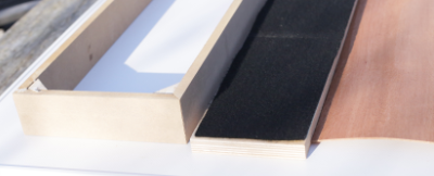 In der Mitte des Bildes zeigen wir unsere vorgefertigte Druckplatte, die zur besseren Verteilung der Presskraft mit Filz beklebt ist. Das Furnier, rechts im Bild, hat eine Stärke von 2,4 mm. Sehr häufig findet man auch das etwas dünnere Furnier von 0,6 mm vor.