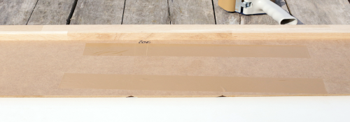 Danach werden die Seitenteile umgedreht und die Außenseiten werden mit Paketband aneinander geklebt. Das braune Paketband ist auf dem MDF schwer zu erkennen, es reiht die Einzelteile genau aneinander.
