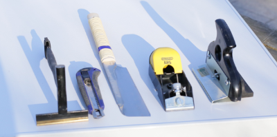 Anbei die Werkzeuge zur Bearbeitung. Von links nach rechts: Anreibhammer, Cuttermesser, Japansäge, Hobel, Kantenhobel.